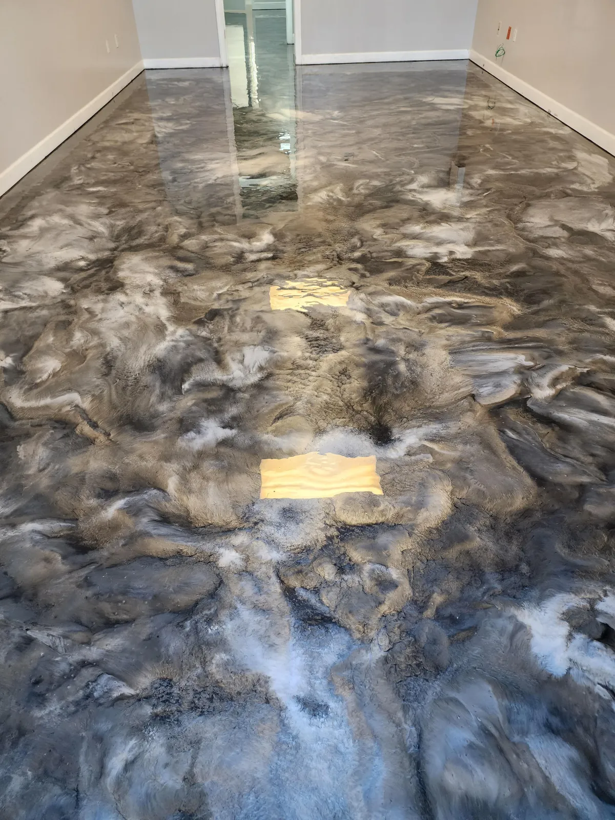 A premium, artistic floor system using metallic pigments suspended in epoxy. Creates a unique 3D effect every time. Durable, stain-resistant, reflective, and easy to clean — perfect for showrooms and luxury spaces.